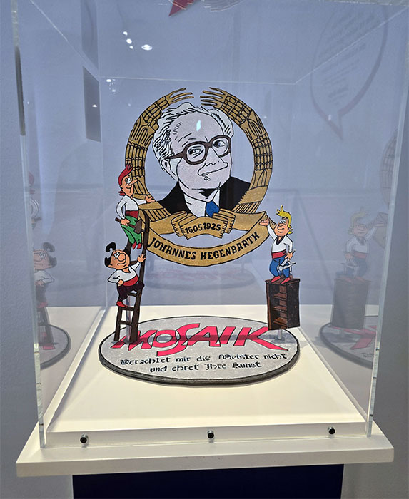 Diese kleine, kompakte Galerieausstellung zu dessen 100. Geburtstag und gleichzeitig 70 Jahre nach Erscheinen des 1. Mosaik, nahm uns mit zurück in die Vergangenheit.