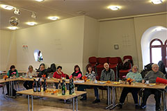Zu diesem Treffen wollten wir uns mit dem Thema "Wein" beschäftigen. Zunächst stärkten wir uns, an herbstlich dekorierten Tischen, mit Kaffee und Bockwurst.