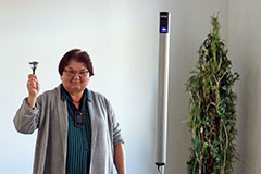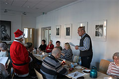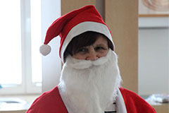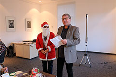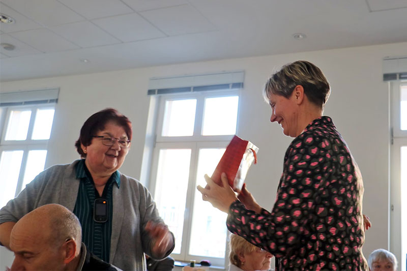 Im Anschluss daran betrat die Weihnachtsfrau den Raum. Für einen kleinen kulturellen Beitrag, erhielt jeder Anwesende ein kleines Geschenk. Zusätzlich gab es für alle einen Wandkalender für 2026, vom Hörzentrum Gromke. Leider verspätet aus verkehrstechnischen Gründen, aber gesund und wohlbehalten, kam Dr. Matthias Müller, Vorsitzender des Landesverbandes der Schwerhörigen und Ertaubten Sachsen. e.V. aus Chemnitz zu uns. Er teilte einige für uns interessante Termine für das kommende Jahr des DSB mit. Auch Dr. Matthias Müller kam nicht mit leeren Händen, sondern es konnten noch Beutel und Kugelschreiber verteilt werden, was von unseren Mitgliedern auch rege und dankbar angenommen wurde. Vielen Dank dafür! Mit einem gemeinsamen Lied "Sind die Lichter angezündet ..." , endete unsere Jahresfeier 2025.
