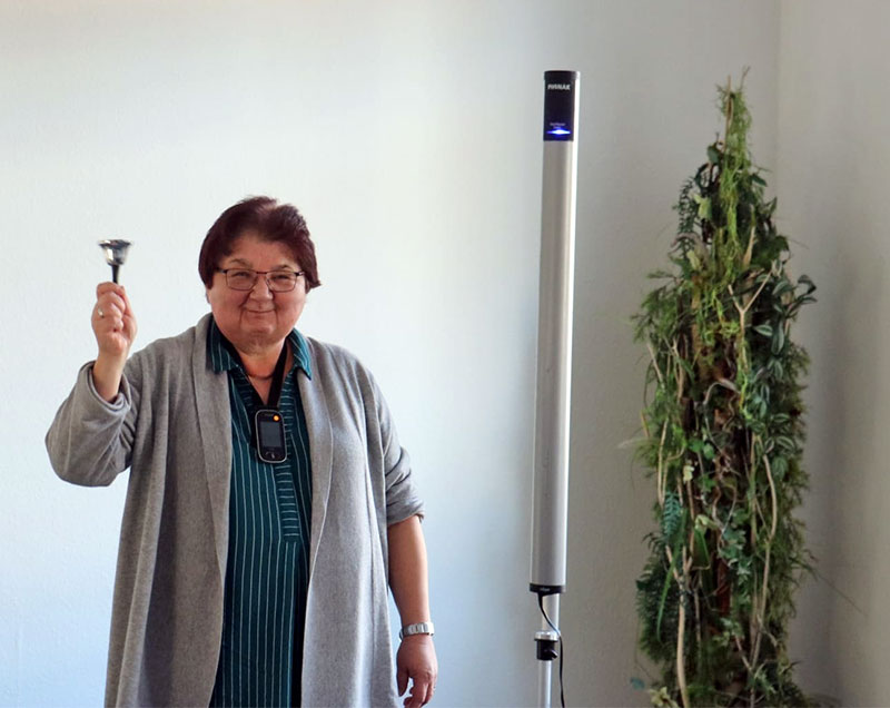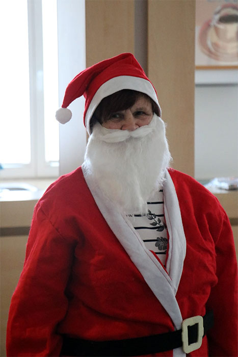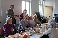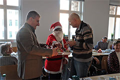 Im Anschluss daran betrat die Weihnachtsfrau den Raum. Für einen kleinen kulturellen Beitrag, erhielt jeder Anwesende ein kleines Geschenk. Zusätzlich gab es für alle einen Wandkalender für 2026, vom Hörzentrum Gromke. Leider verspätet aus verkehrstechnischen Gründen, aber gesund und wohlbehalten, kam Dr. Matthias Müller, Vorsitzender des Landesverbandes der Schwerhörigen und Ertaubten Sachsen. e.V. aus Chemnitz zu uns. Er teilte einige für uns interessante Termine für das kommende Jahr des DSB mit. Auch Dr. Matthias Müller kam nicht mit leeren Händen, sondern es konnten noch Beutel und Kugelschreiber verteilt werden, was von unseren Mitgliedern auch rege und dankbar angenommen wurde. Vielen Dank dafür! Mit einem gemeinsamen Lied "Sind die Lichter angezündet ..." , endete unsere Jahresfeier 2025.